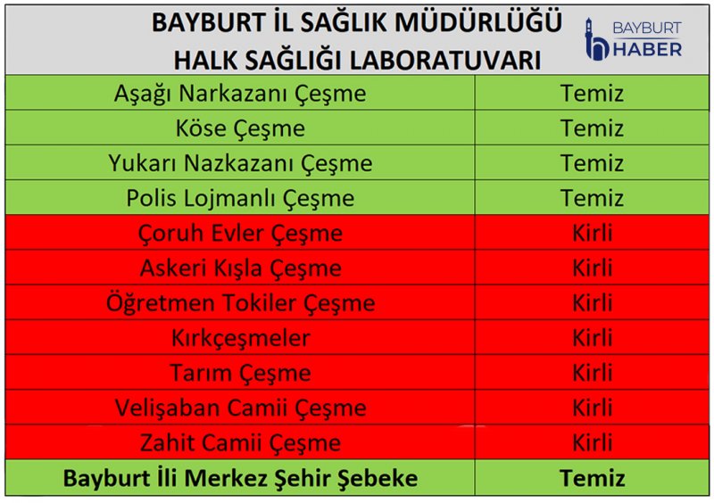Bayburt İl Sağlık Müdürlüğü Halk Sağlığı Laboratuvarı, Kasım ayı içme ve kullanma suyu analiz sonuçlarını açıkladı. Yapılan değerlendirmelerde şehir şebeke suyunun temiz olduğu belirlenirken, kentteki bazı çeşmelerde kirli su tespit edildiği bildirildi.