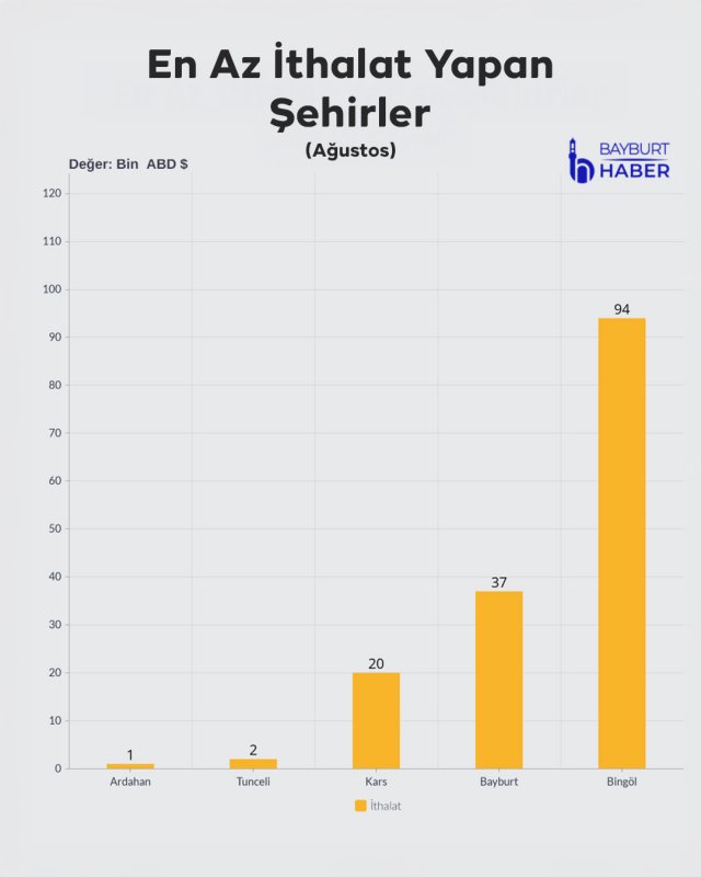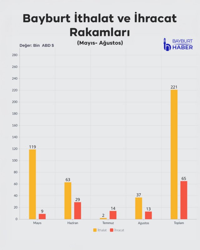 2025’in ilk 8 ayında Bayburt’un toplam ihracatı 150 bin dolar olurken, ithalatı 1 milyon 280 bin dolar olarak kaydedildi. Bu rakamlar Bayburt’u Türkiye’nin en az dış ticaret yapan şehirleri arasına yerleştirdi. TÜİK verilerine göre Bayburt, ihracatta sondan 1’inci, ithalatta ise sondan 4’üncü sırada yer aldı.