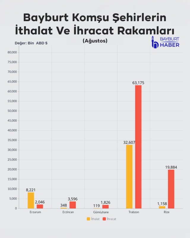 Bayburt’un komşu şehirleriyle kıyaslandığında da en düşük rakamlar dikkat çekti. Erzurum’un ihracatı 2 milyon 46 bin dolar, Erzincan’ın 3 milyon 596 bin dolar, Gümüşhane’nin 1 milyon 826 bin dolar, Trabzon’un 63 milyon 175 bin dolar ve Rize’nin 19 milyon 884 bin dolar olarak kaydedildi. İthalatta da Bayburt, komşuları arasında en düşük rakamlara sahip şehir oldu.