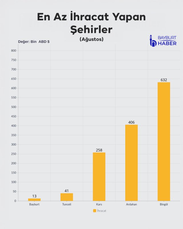 TÜİK’in 2025 Ağustos verilerine göre Bayburt, ihracatta Türkiye’nin en düşük rakamlarına sahip şehir oldu. Temmuz ayında 14 bin dolar olan ihracat, ağustosta 13 bin dolara düştü. İthalat ise 2 bin dolardan 37 bin dolara yükseldi.