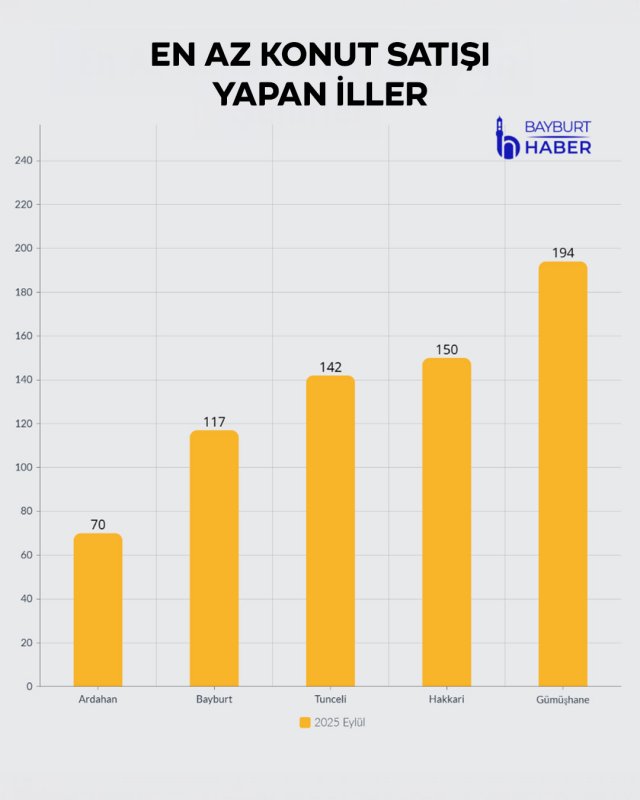 TÜİK’in 2025 Eylül ayı konut satış verilerine göre Bayburt, ülke genelinde en az konut satışı yapılan iller arasında yer aldı. Kentte satış sayısı geçtiğimiz yıla göre artış gösterse de, genel tablo Bayburt’un konut piyasasında düşük bir seyir izlediğini ortaya koydu.