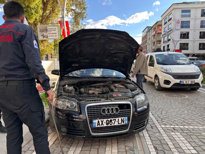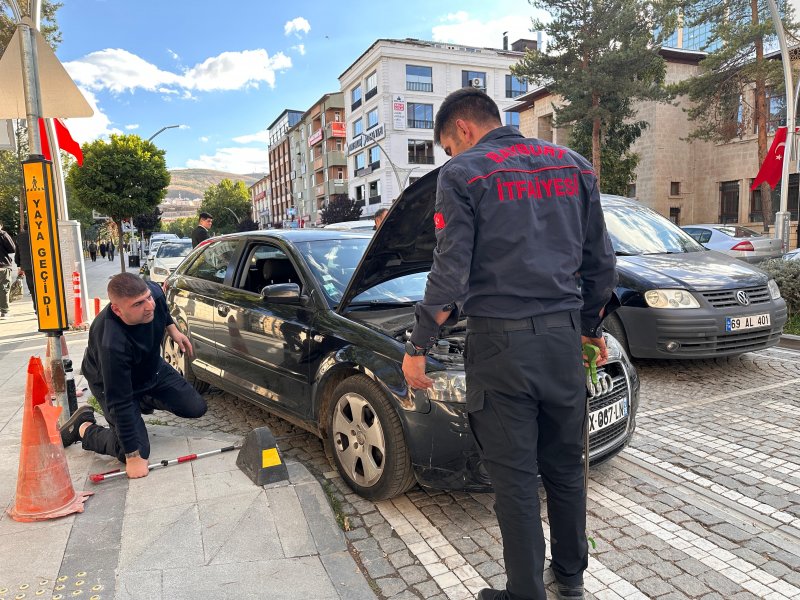 Bayburt Cumhuriyet Caddesi’nde park halindeki bir yabancı plakalı araç sahibi, motor bölümünde kediyi fark ederek aracını daha fazla hareket ettirmeden Bayburt İtfaiyesi’ni aradı.