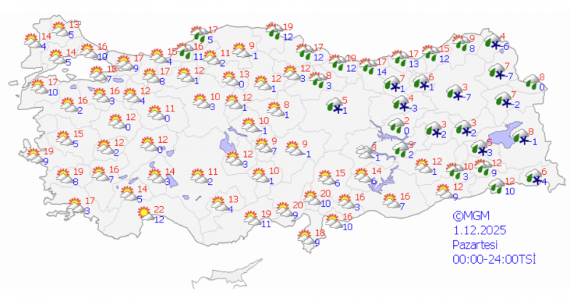Meteoroloji Genel Müdürlüğü (MGM) tarafından yayınlanan 5 günlük hava tahmin raporuna göre, pazar günü Türkiye genelinde 80 ilde yağış bekleniyor. Pazartesi ise Bayburt, Sivas, Gümüşhane, Erzincan, Bingöl, Erzurum, Muş, Bitlis, Hakkari, Van, Ağrı, Kars ve Ardahan’da hafif kar ve karla karışık yağmur öngörülüyor.