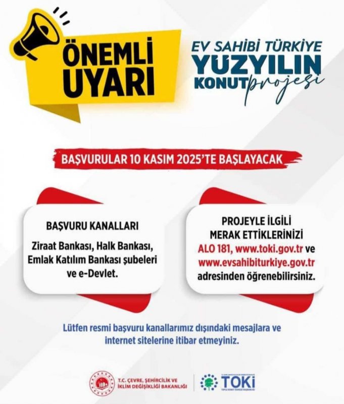 TOKİ’nin “Yüzyılın Konut Projesi” kapsamında Türkiye genelinde 500 bin sosyal konut inşa edilecek. Başvurular 10 Kasım – 19 Aralık 2025 tarihleri arasında e-Devlet ve banka şubeleri üzerinden yapılacak. Projede, emekliler, gençler, çocuklu aileler, engelliler ve şehit yakınları için özel kontenjanlar ayrıldı.